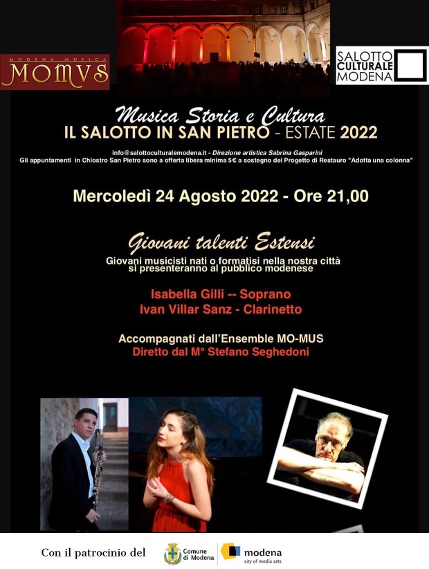 Nel cartellone dell’Estate modenese 2022 Mo-Mus ha presentato due giovanissimi solisti legati alla nostra città attraverso il progetto “Giovani talenti estensi”, il giovane soprano modenese Isabella Gilli e il clarinettista Ivan Villar Sanz (laureaotsi presso l’ISSM “Vecchi-Tonelli di Modena) si sono esibiti accompagnati dall’ensemble dell’associazione.